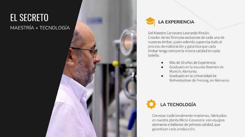 Nuestra garantía de calidad es llevada de la mano de nuestro Maestro Cervecero, graduado en la Universidad de Weheistephan de Freising y en la escuela Doemen de Munich ambas de Alemania, con más de 35 años de experiencia, quien además supervisa todo el proceso de elaboración y garantiza que cada Ambar tenga siempre la misma calidad en cada botella.