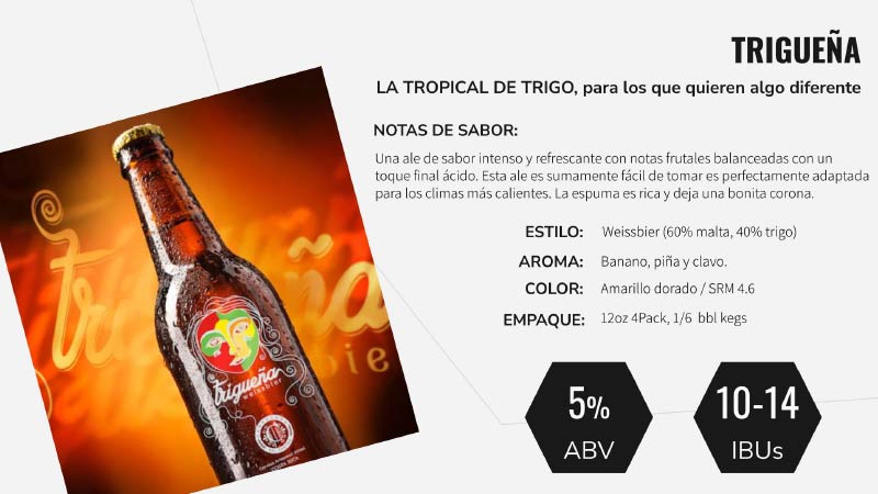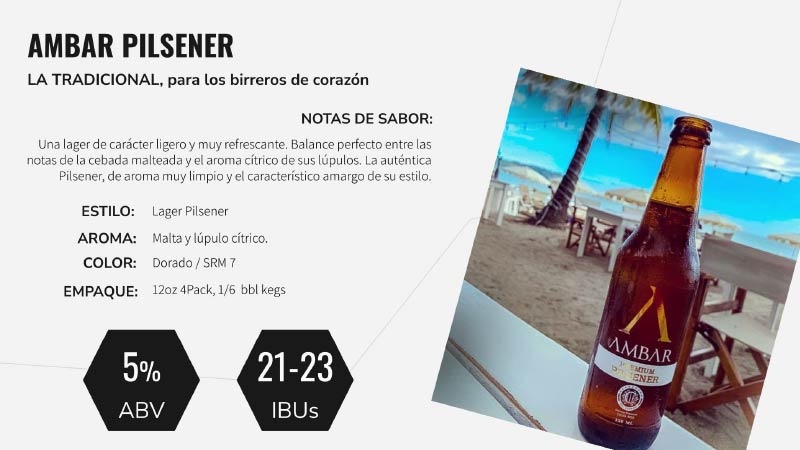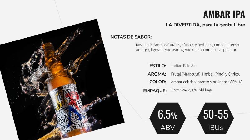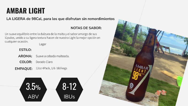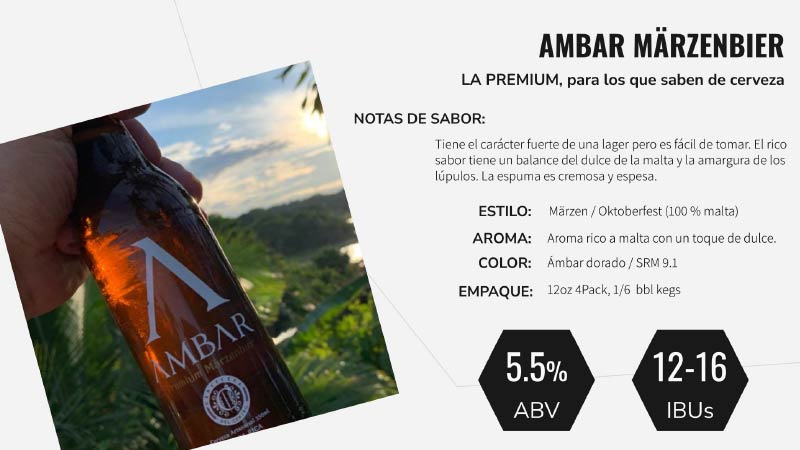Nuestra marca comercial es “AMBAR”, bajo la cual se comercializa toda la familia de nuestros productos, a saber, Premium Marzenbier, Premium Pilsener, IPA, Light, Trigueña, Sin Gluten, CBD, Cero y Ultra.