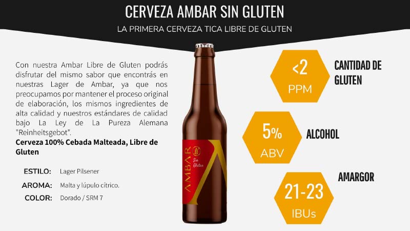 Ambar Libre de Gluten es el mismo sabor que encontrás en nuestras Lager de Ambar, ya que nos preocupamos por mantener el proceso original de elaboración, los mismos ingredientes de alta calidad. Cerveza 100% Cebada Malteada, Libre de Gluten. Gluten 2 PPM / ABV 5 / IBUs 22-23.